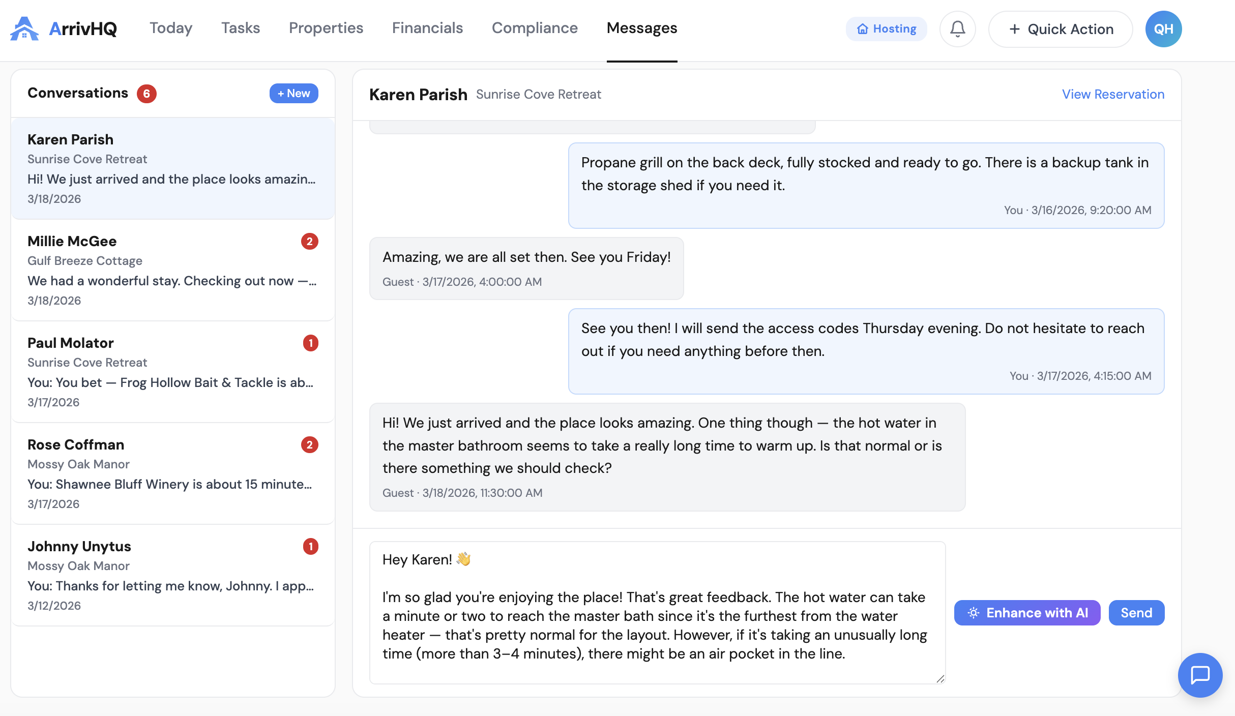 Manage your vacation rentals with calm confidence. From Airbnb and VRBO reservations to turnovers, team coordination, guest communication, and compliance — with AI that drafts replies, reads receipts, and answers your guests instantly.